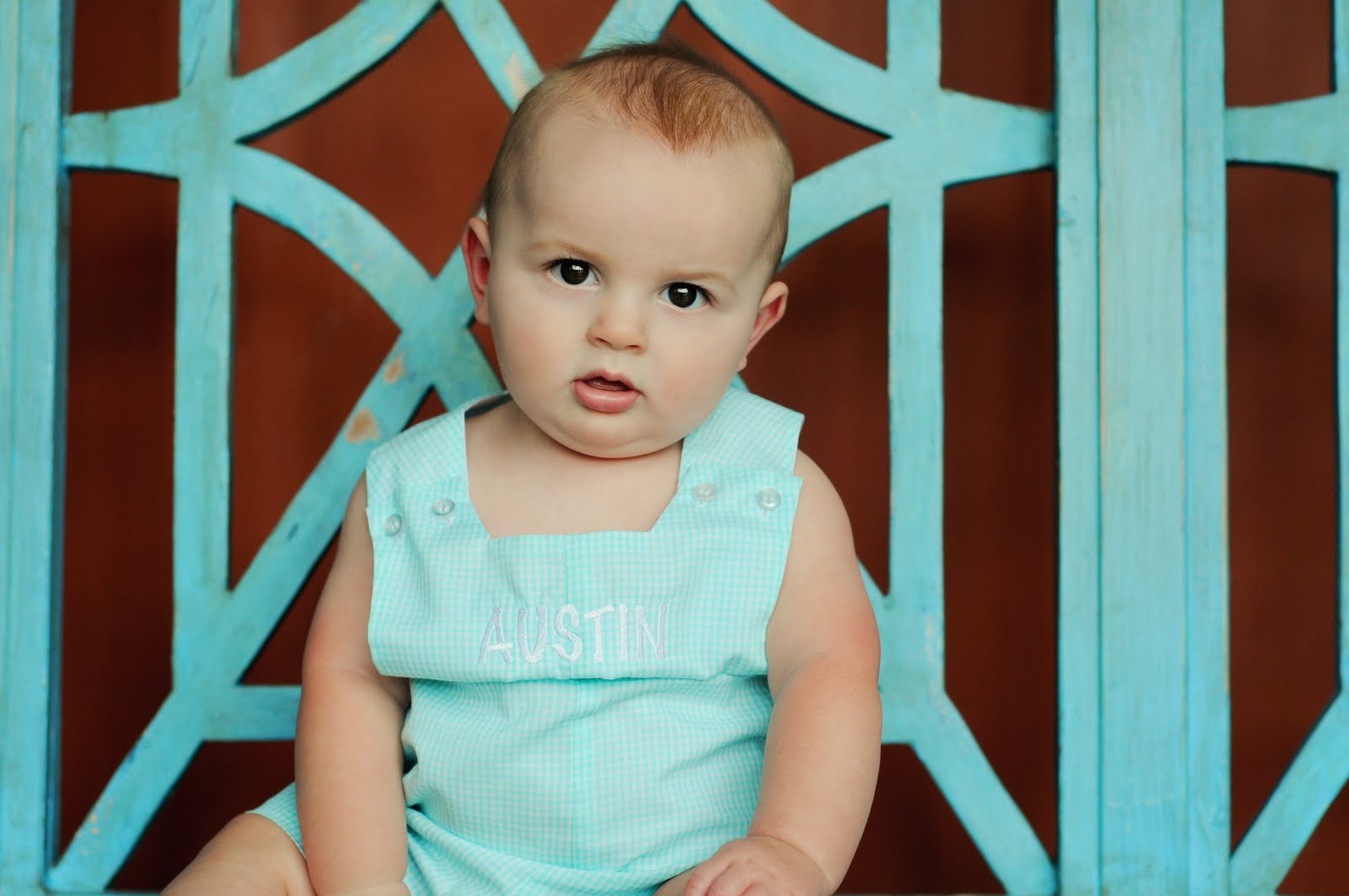 We had a great time getting Austin's 9 months pictures done...they were actually done at 10 months based on our timing. He was so good again! Poor thing had a cold or allergies or something that you can see in his eyes, but he was still such a good sport. The first outfit with the sailboats was Allen's when he was little. His mom made it, and I think Austin looks adorable in it.
